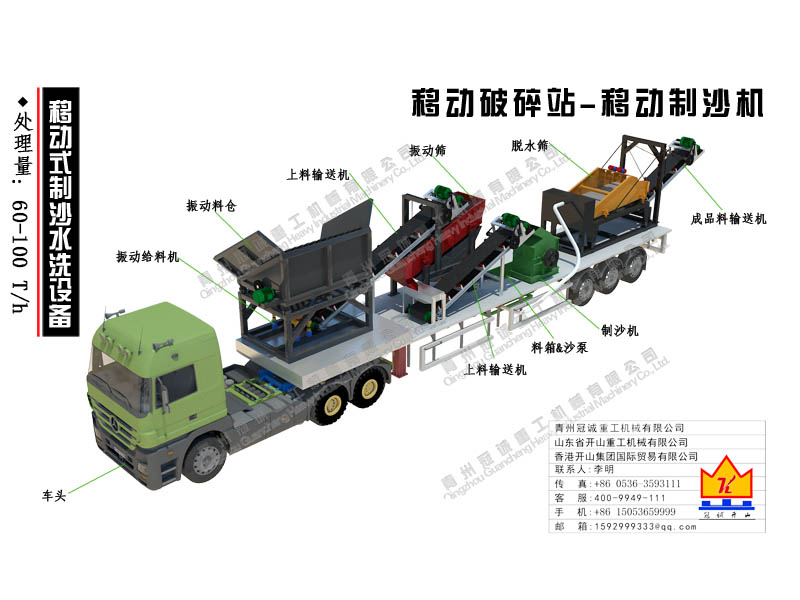 本套移動破碎站為移動式制沙水洗設(shè)備,處理量為每小時(shí)60-100噸,本移動破碎站是青州冠誠重工機(jī)械有限公司獨(dú)立設(shè)計(jì)制作而成,直接采用17.5米半掛車底盤改裝制作,其優(yōu)勢如下: