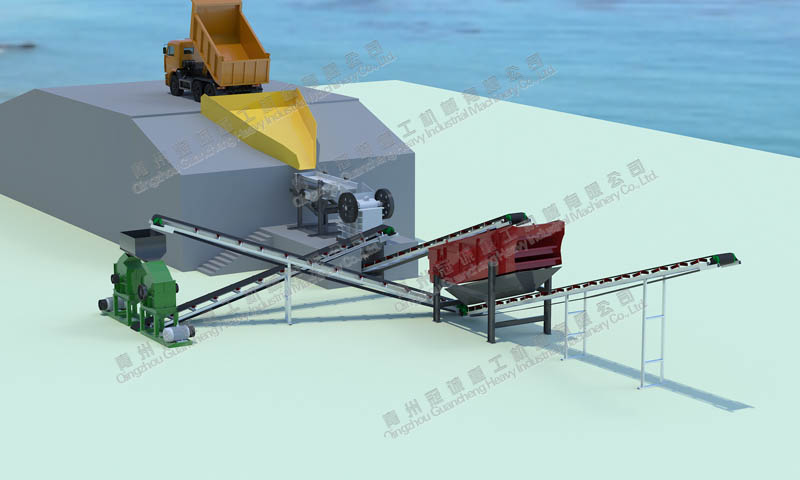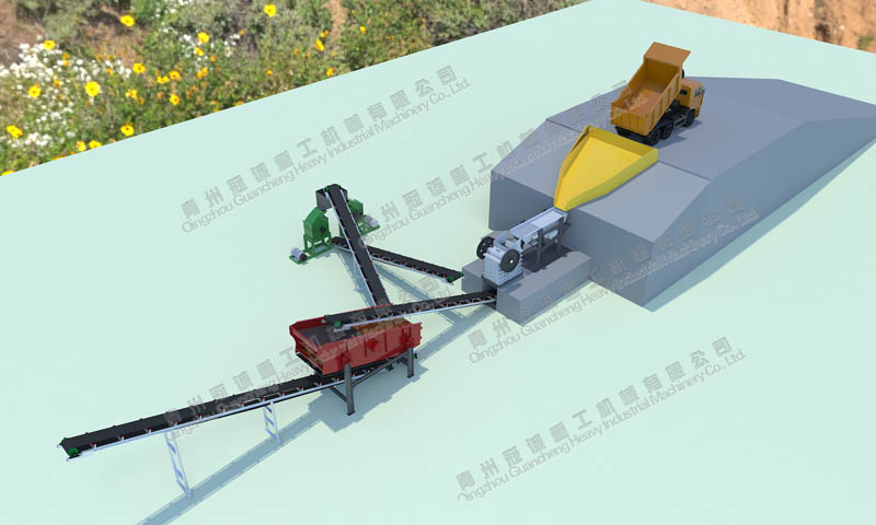 原料通過工程車輛送入進(jìn)料斗,由進(jìn)料斗進(jìn)入振動給料機(jī)內(nèi)均勻給料進(jìn)入一臺600*900鍔式破碎機(jī)或者一臺1416#重錘破碎機(jī)內(nèi)進(jìn)行粗破,破碎后的物料通過上料輸送機(jī)送入一臺2160#振動篩內(nèi)進(jìn)行篩選分級為:4mm以下與4mm以上兩種規(guī)格;